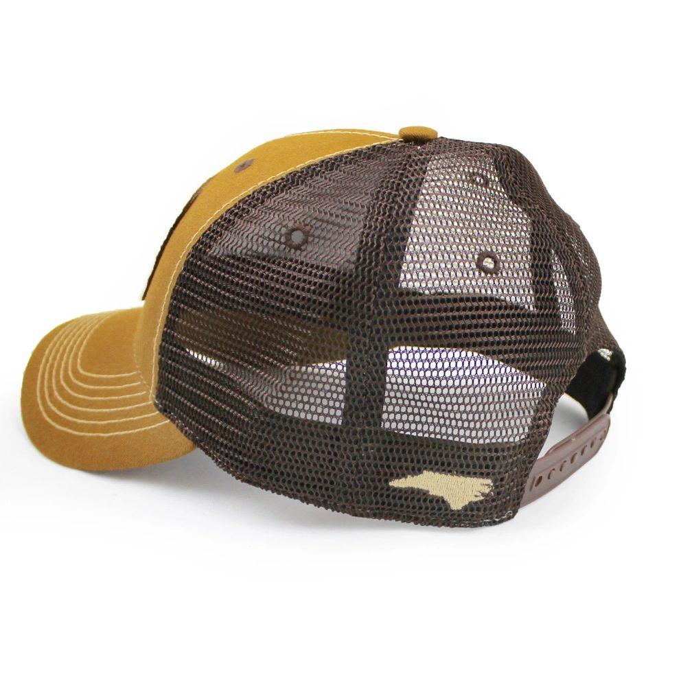 The Great State of North Carolina flag NOW on a structured trucker hat! This hat is a low to medium profile.  Designed by our staff in New Bern, NC. The front panels are 100% cotton and have a backing to create a stiff trucker. The high thread count embroidered flag patch and the small embroidered state outline on hat back creates a great look. Hat is adjustable with snaps. Bill has a natural bend. Front panels are tobacco brown and the back mesh is dark brown. The structures hats are becoming very popular. Shop North Carolina Flag Patch Trucker Hat, Structured, Tobacco Brown only at S.L. Revival Co.