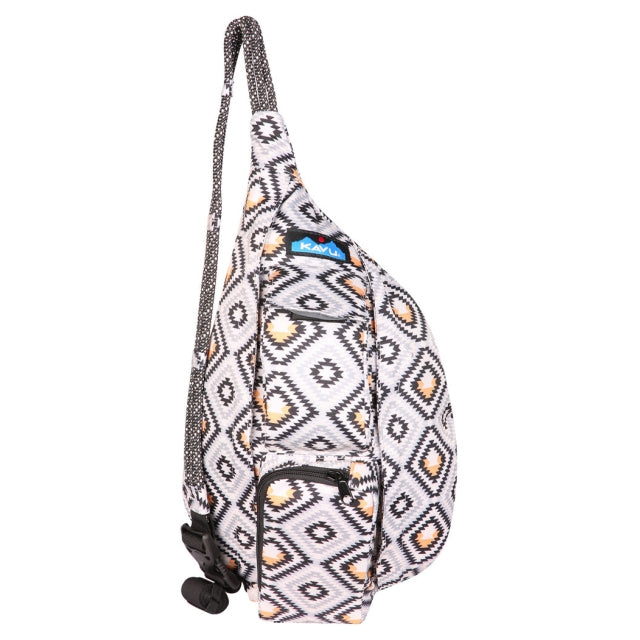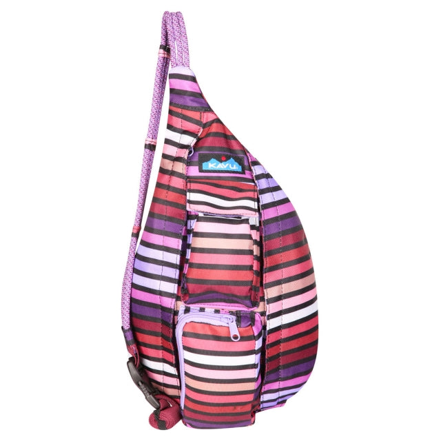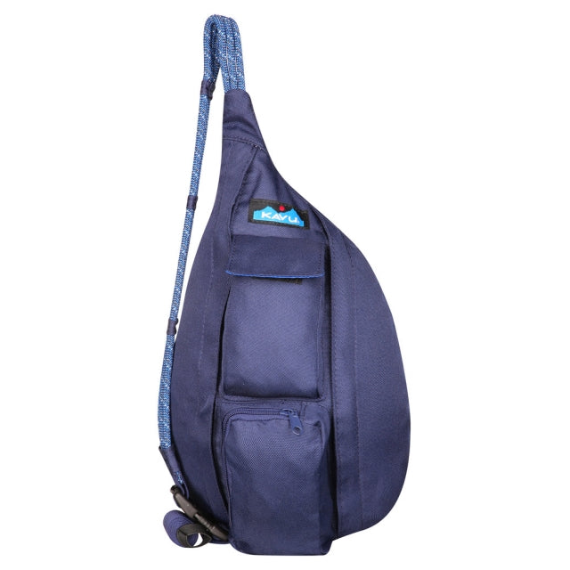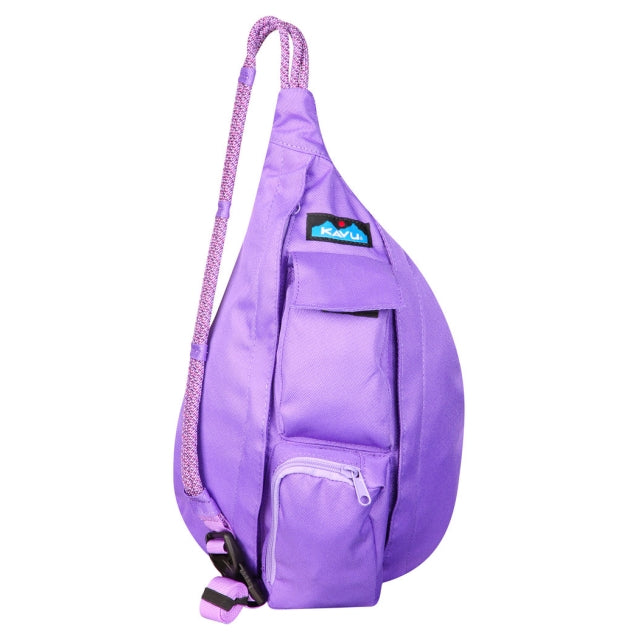 This polyester mini sling pack features an adjustable rope shoulder strap and side release buckle, two vertical zip compartments, two key or cell phone pockets, padded back with KAVU embroidery.