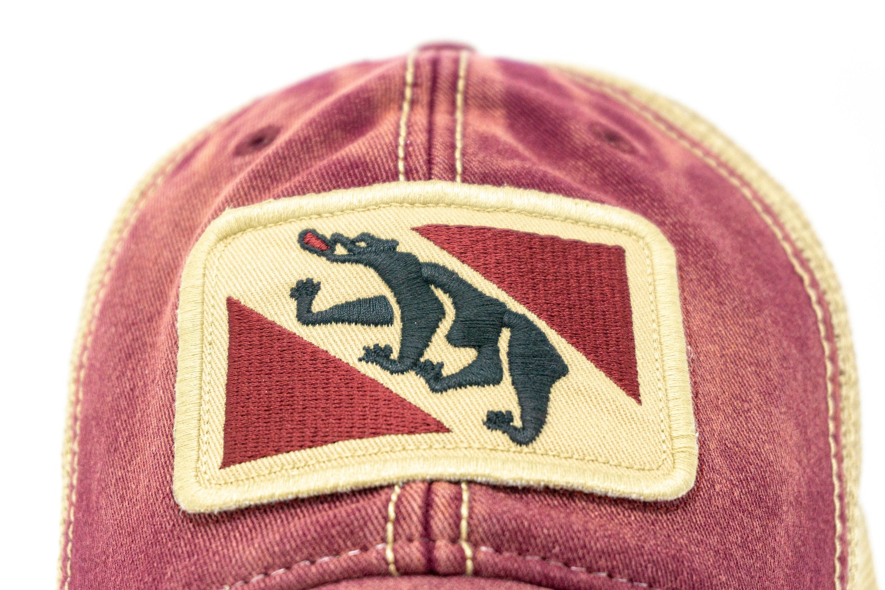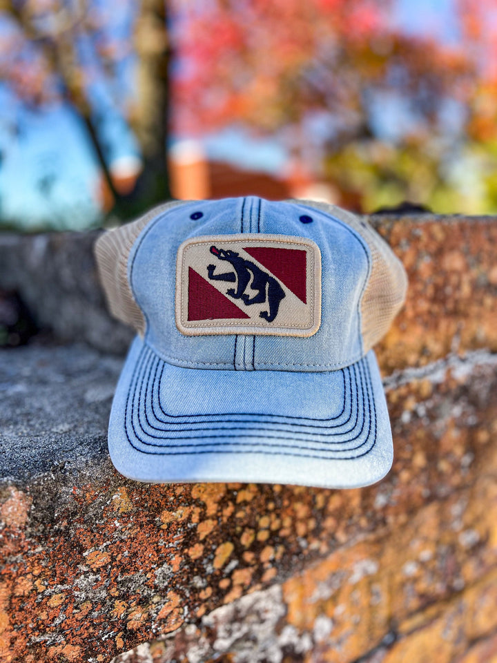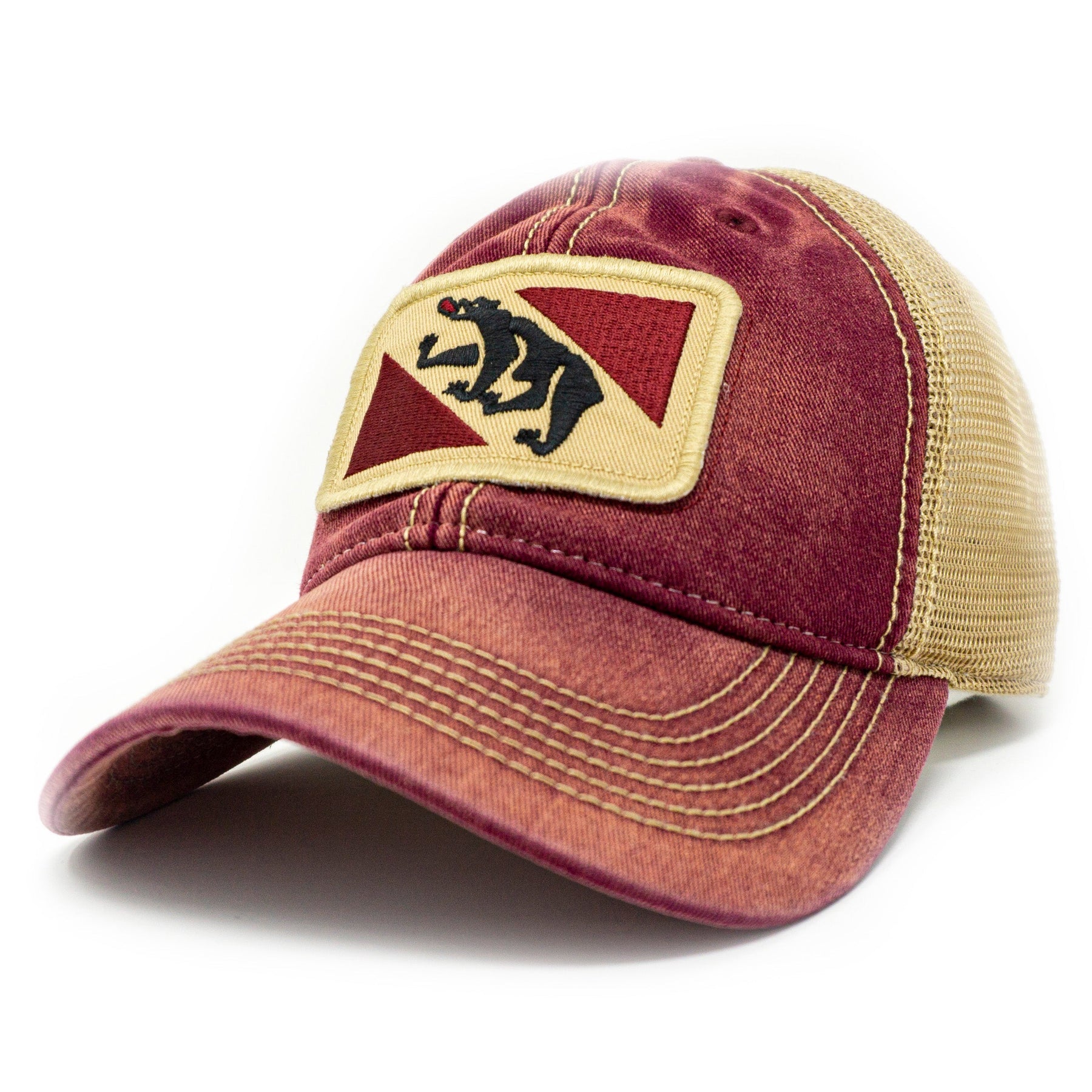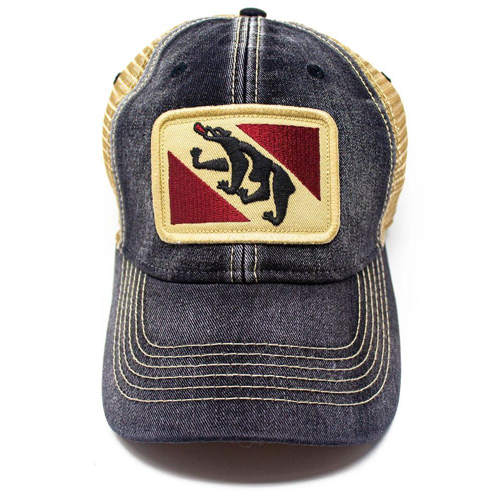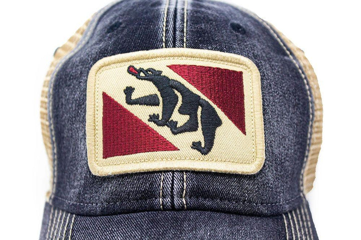 The vintage New Bern City flag cap and also the town flag of Bern, Switzerland! Designed by our staff in New Bern, NC. The New Bern Flag Hat has a Salt-Wash™ to create a weathered, heavily sun bleached look. The high thread count embroidered flag patch creates a vintage look. Hat is adjustable with snaps. Mesh is soft and bill has a natural bend. This hat is heavily faded making each hat uniquely different. Our vintage state flag patch trucker hats are not to miss.