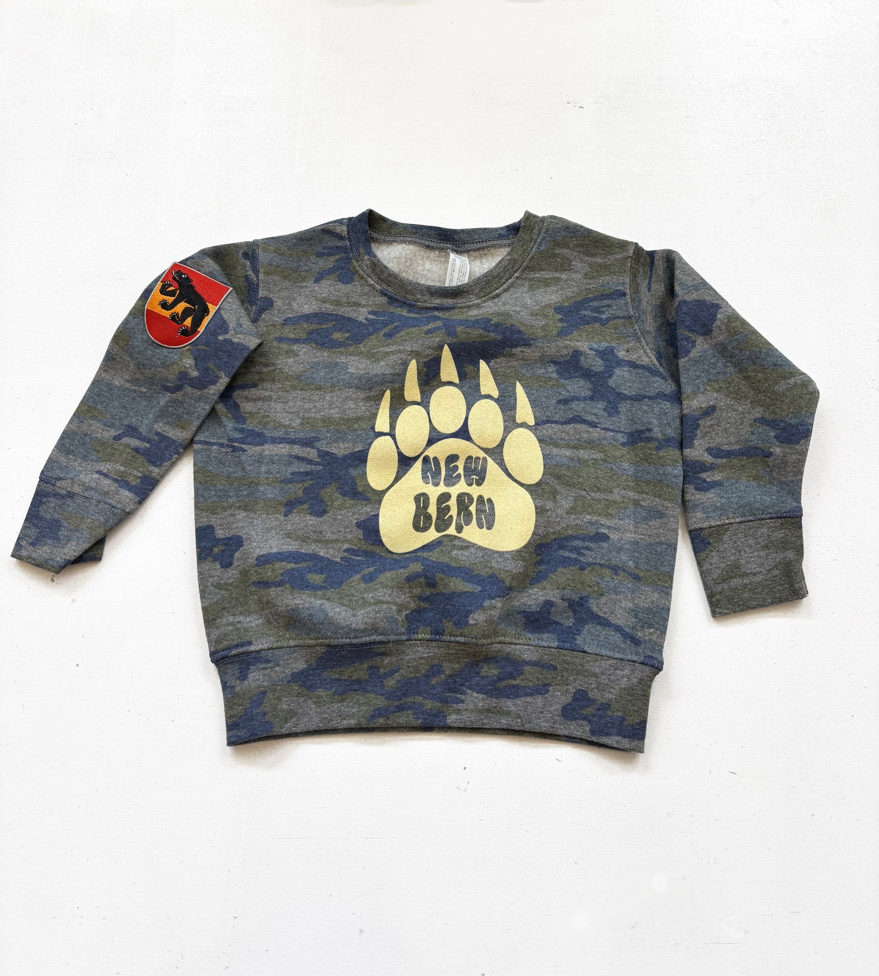 Get your little ones repping their hometown with the NB Paw Goodie Kid Crewneck Sweatshirt. Featuring a playful paw graphic, this sweatshirt shows off their New Bern pride in style. Available in a Vintage Camo and Mauvelous, this sweatshirt is perfect for the quirky and fun-loving kiddos in your life.