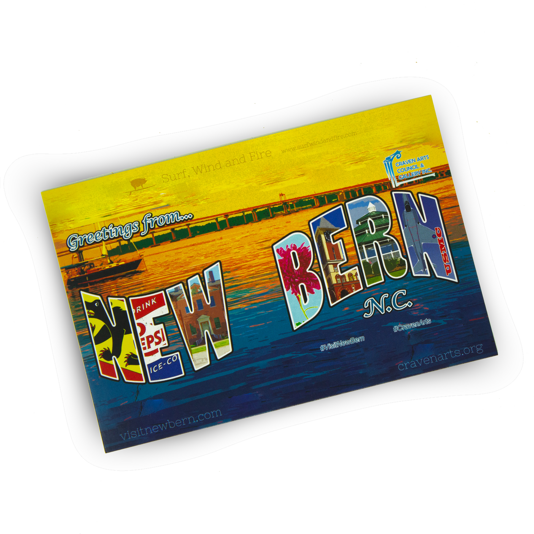 Say hello to the New Bern Mural Postcard, your new favorite way to send greetings from this charming town! Featuring a stunning mural, this postcard is a must-have for any New Bern lover. Say it loud and proud with this quirky and playful addition to your postcard collection! Exclusively at Surf, Wind and Fire. Net proceeds support the Bank of the Arts.