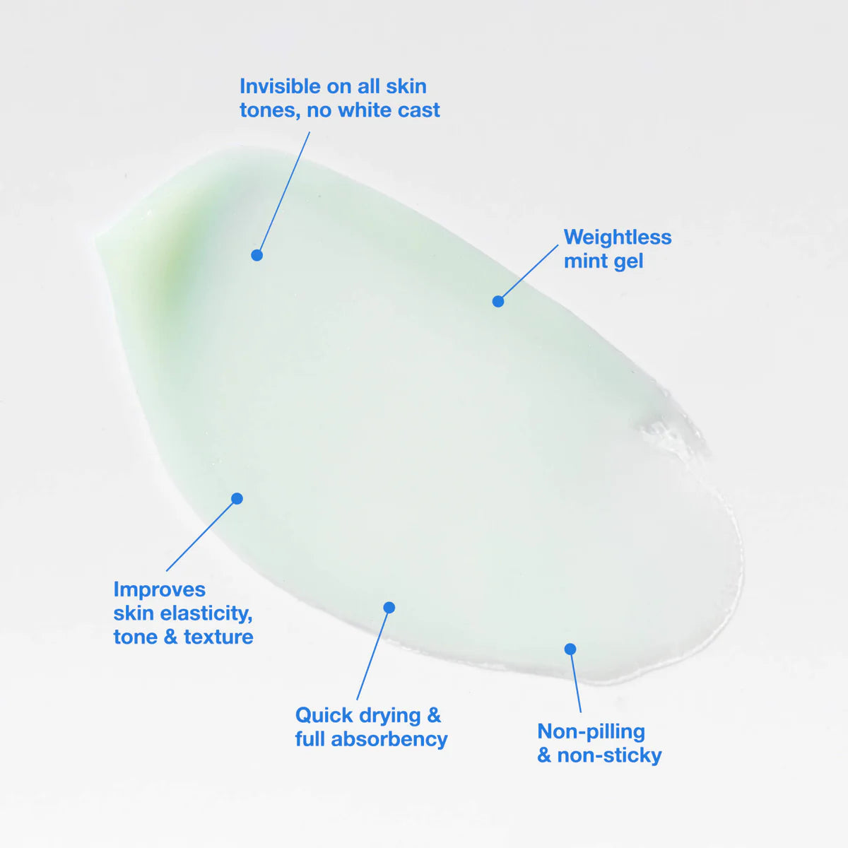 INVISIBLE ON ALL SKIN TONES, NO WHITE CAST • WEIGHTLESS GEL CREAM TEXTURE & MASS TONE • WATERY AND COOLING ON SKIN • QUICK DRYING AND FULL ABSORBENCY • NON PILLING