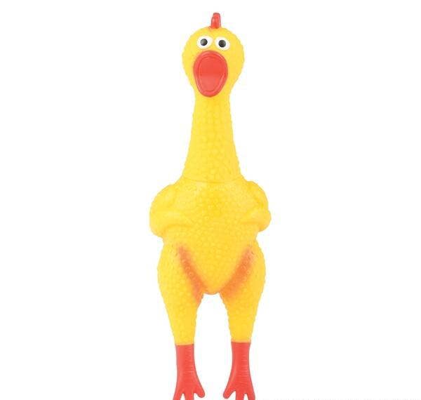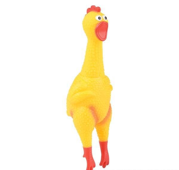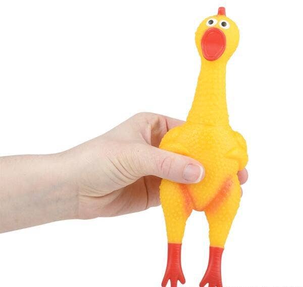 8-Inch Rubber Chicken With Sound Packaged in a polybag. Ages 3+
