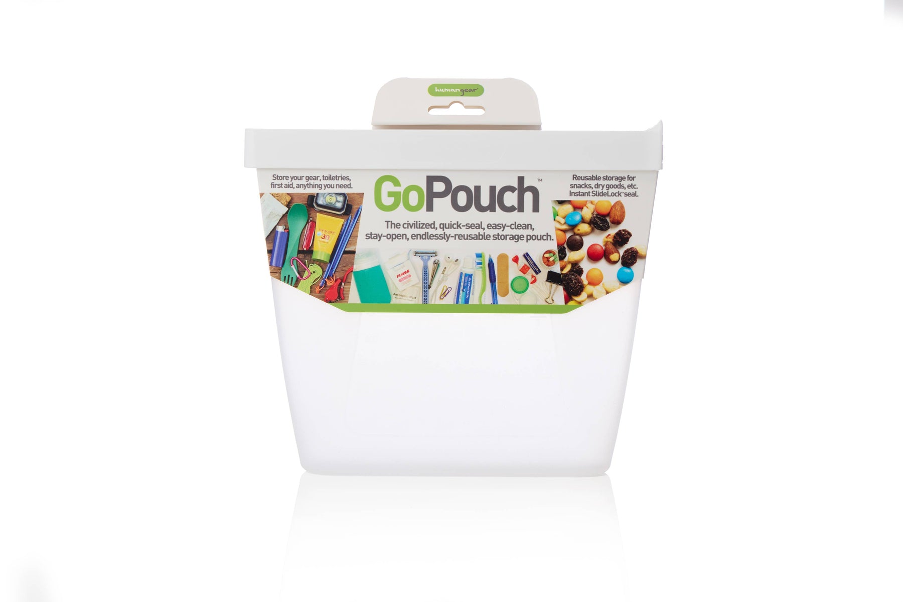The civilized, quick-seal, easy-clean, stay-open, endlessly-reusable storage pouch - Rigid flex-frame allows pouch to stay open - SlideLock sealing rail creates quick, leaktight seal - No more fussing with pinch-type seals or wondering if the entire seal is closed - Smooth interior surface wipes clean with no nooks and crannies - Flat base allows pouch to stand up - FDA food safe material - BPA-free, PC-free, and phthalate-free The GoPouch by humangear is your versatile, eco-friendly storage solution designed for life's everyday adventures. Made from durable, water-resistant silicone, these pouches come in various sizes to keep your essentials organized and protected. Whether you're storing snacks, tech accessories, or toiletries, the GoPouch offers a sustainable way to keep your items secure and easily accessible on the go.