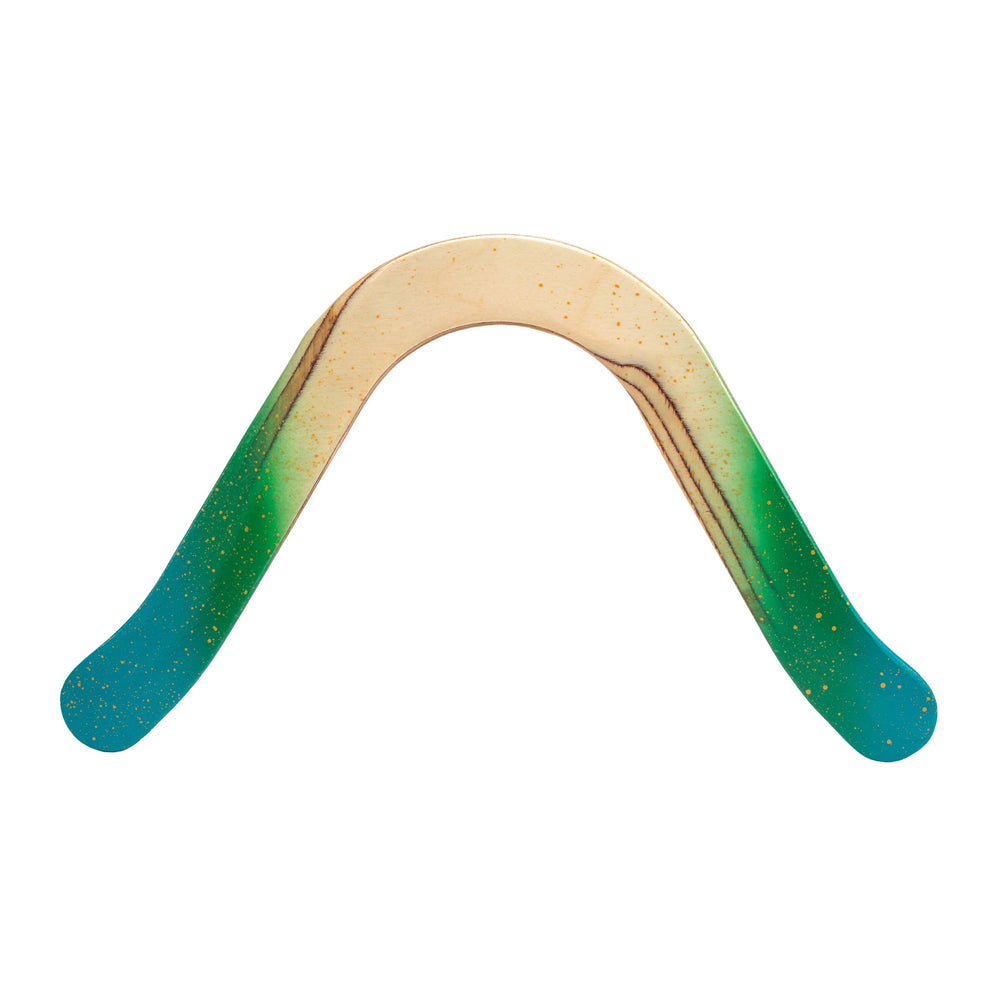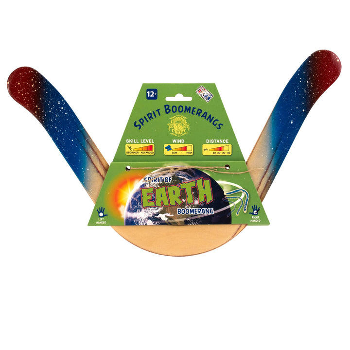 Handcrafted out of Birchwood and splattered with an assortment of colors, this Earth 'Rang flies the farthest- traveling about 50 yards before returning to you. Complete with flight instructions and U.S. Boomerang Association membership application.