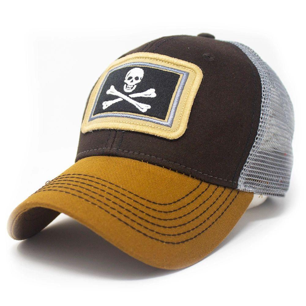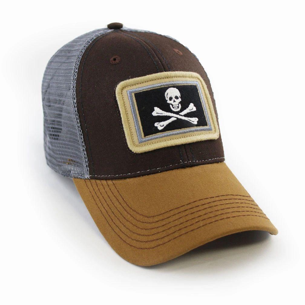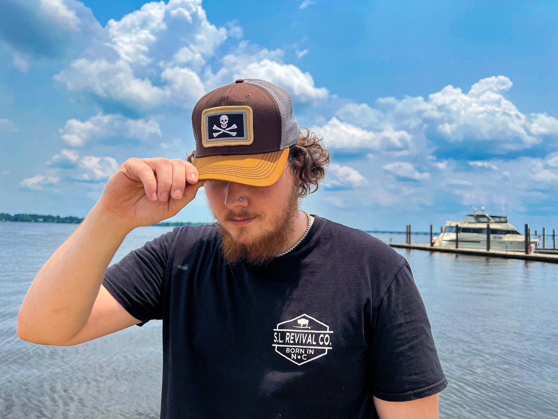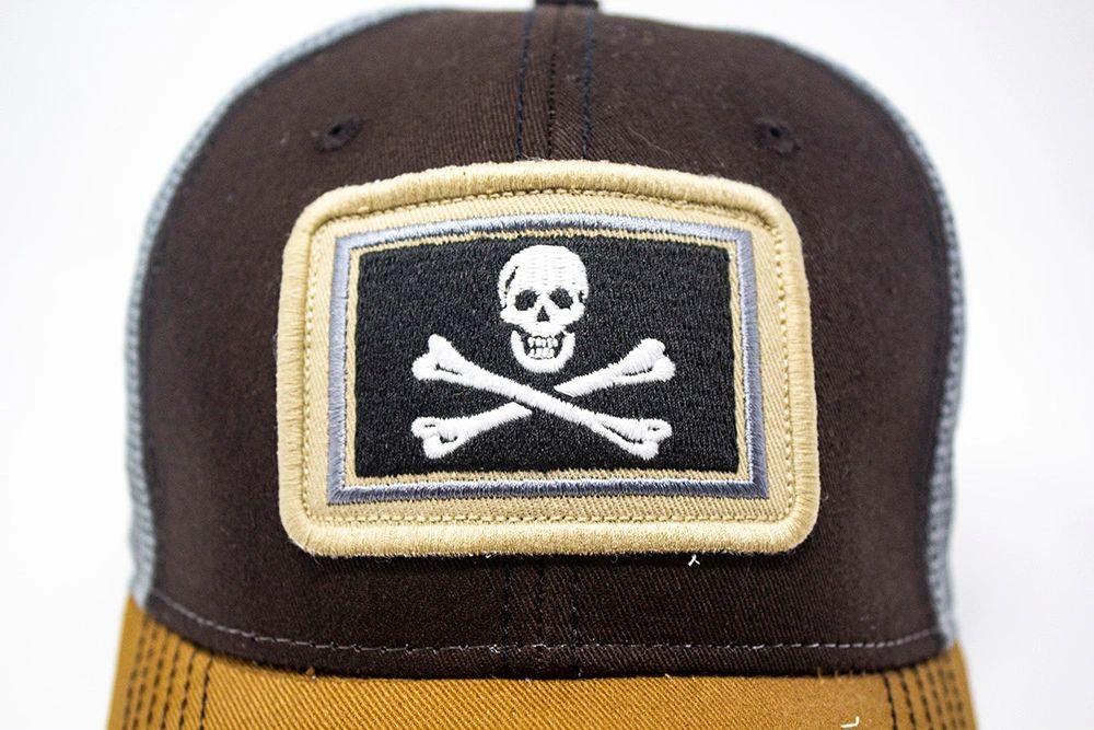 Our new low to medium profile, structured trucker hat is now available. Structured hats have not been Salt-washed™ for softness and fading. These hats are stiffer and the colors are brighter. The fit profile is very similar to our popular vintage-style Salt-washed™ trucker hats. Adjustable snap in the back allows for a proper fit and we have color-blocked this style with a mesh color, front panel color and bill color. A really cool addition is the small embroidery of a ship's cannon on the back. We think you will love the Calico Jack's Jolly Roger Pirate Flag Structured Trucker Hat, Timber Brown. Shop Calico Jack's Jolly Roger Pirate Flag Structured Trucker Hat, Timber Brown only at S.L. Revival Co.