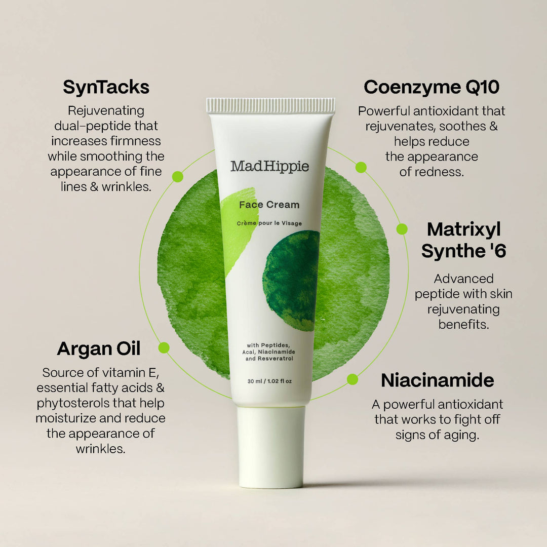Packed with Peptides and Antioxidants, including Niacinamide & Acai, our Face Cream is a light, easily absorbing formula that hydrates, calms & revitalizes the skin, naturally! With Niacinamide, Advanced Peptides & Argan Oil. Keep wrinkles at bay and firm aging skin with our refreshing facial moisturizer packed with peptides and antioxidants. ANTI-AGING FACE CREAM: The potent antioxidants in our light and refreshing skin-firming formula feature niacinamide, resveratrol, green tea, and acai berry. BEST MOISTURIZER FOR ALL SKIN TYPES: The Mad Hippie Face Cream is a light, easily absorbing formula that naturally hydrates, soothes, and rejuvenates aging, sensitive & acne-prone skin.