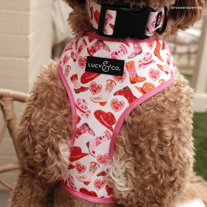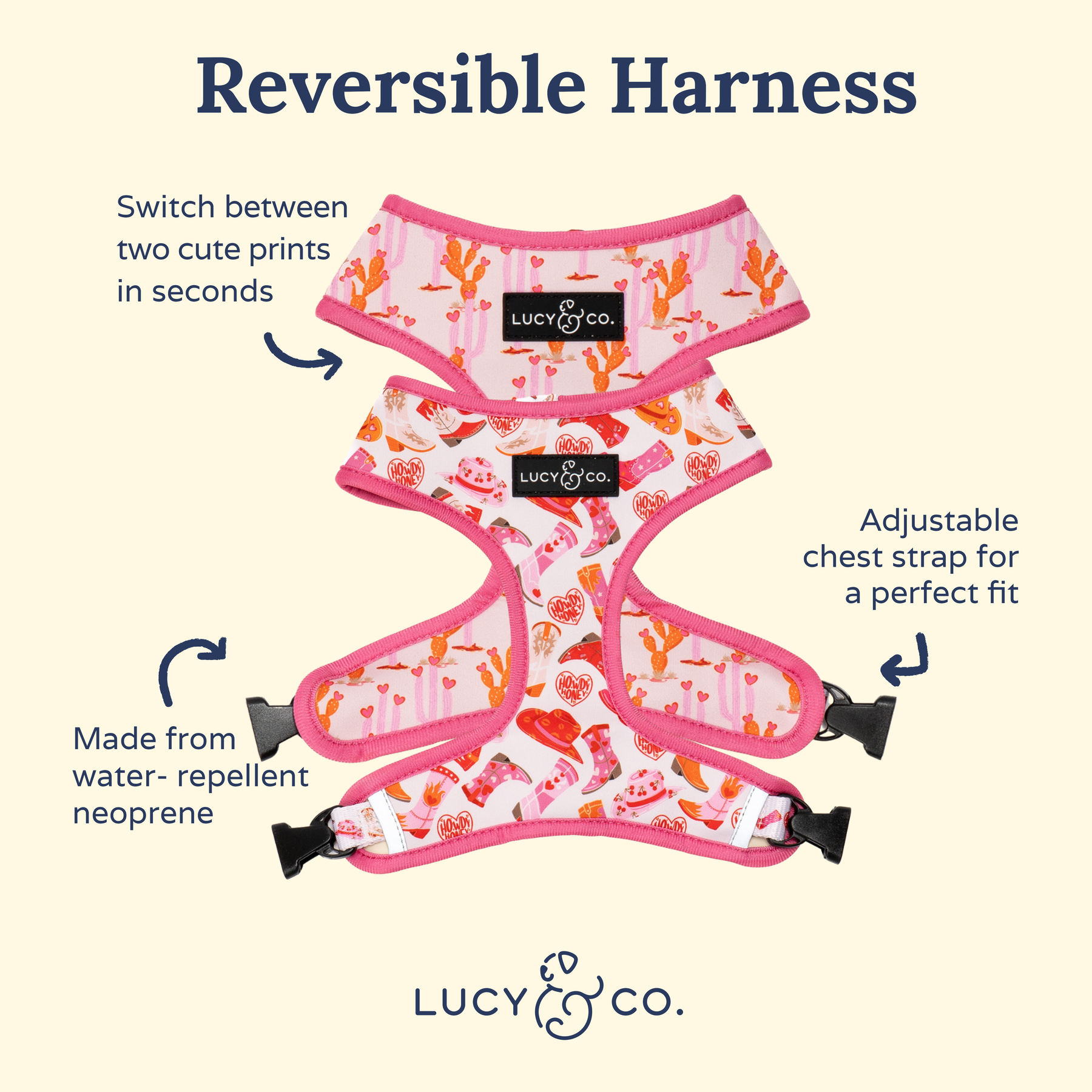 Howdy Honey! Let's hit the dusty trail and walk around the block in the Howdy Honey Reversible Holiday Dog Harness. Made with water-repellent neoprene, this harness features two prints in one and it's easy to swap to the other side for a brand new look! Explore our reversible harnesses for an easy-care for fit that moves with all of your pups natural wiggles and shakes.