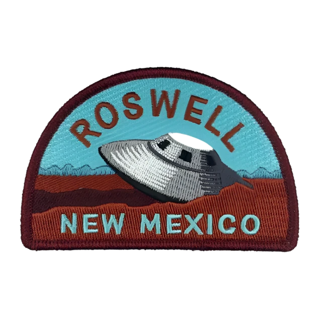 Roswell, New Mexico travel patch featuring the legendary UFO crash reported to have taken place on the Brazel Ranch back in July 1947. The lore says the wreckage was transported to the local Roswell Air Force Base, and later the Air Force publicly announced they had collected the remains of a crash "flying saucer", only to recant that a few days later. 3.5" W x 2.3" H 100% embroidered available with iron-on or hook-and-loop backing