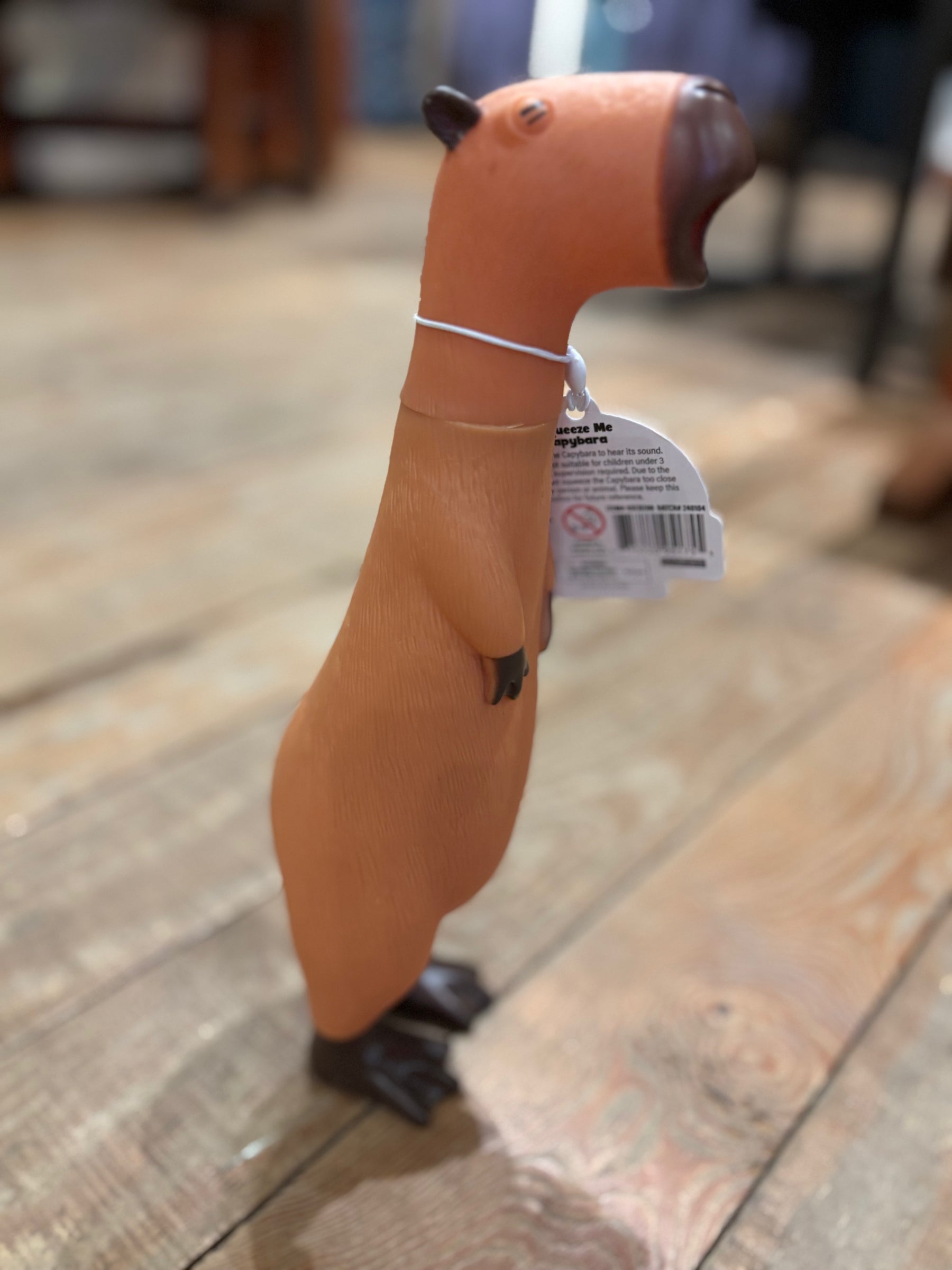 Everyone loves a Capybara, and this adorable squeaky toy is guaranteed to become an instant favorite. Standing approximately 10 inches tall, this plush companion features a satisfying squeeze mechanism that triggers an unmistakable capybara scream—the perfect blend of hilarious and heartwarming. Whether you're looking for a conversation starter, a desk buddy, or the ultimate gag gift, this squeezable capybara delivers endless entertainment and laughter. Its soft, huggable design makes it irresistible for kids and adults alike, while the novelty sound effect ensures it's always a hit at parties, pranks, or casual hangouts. Bring home the joy and quirky charm of everyone's favorite semi-aquatic rodent. This is the gift that keeps on giving smiles.