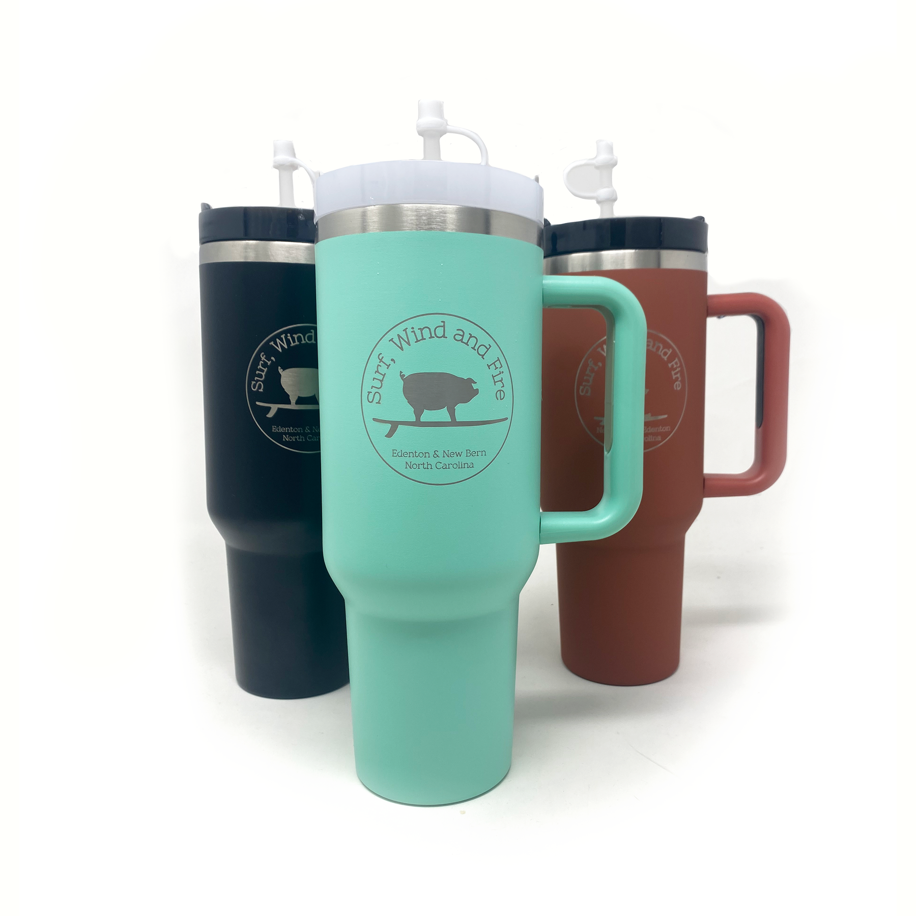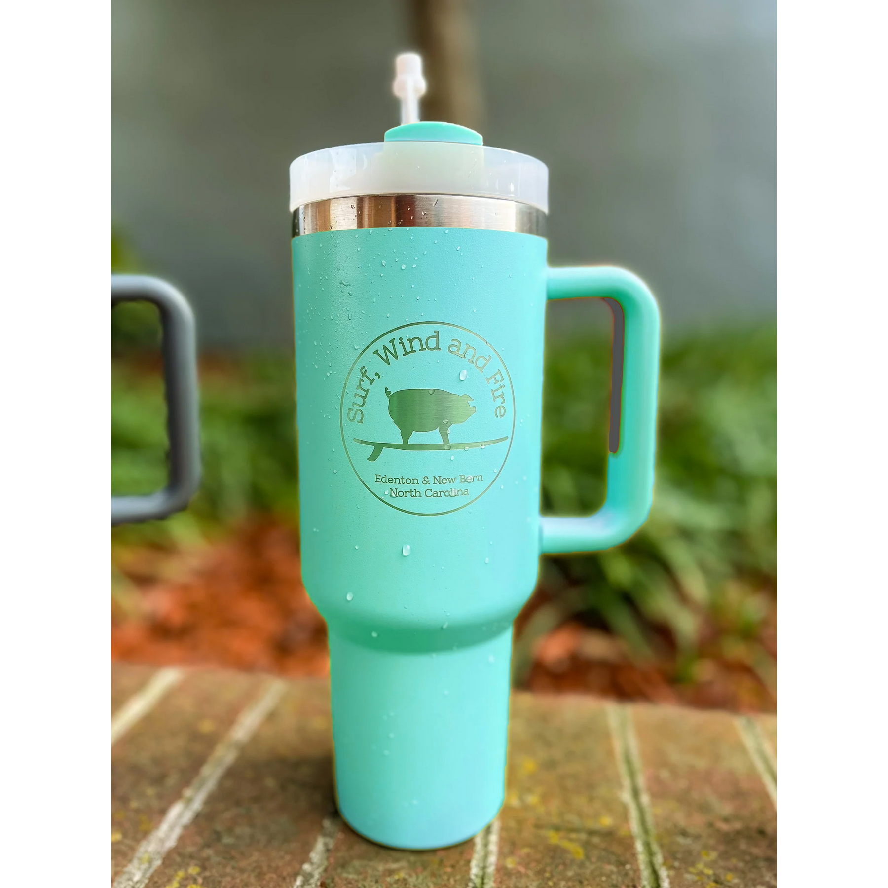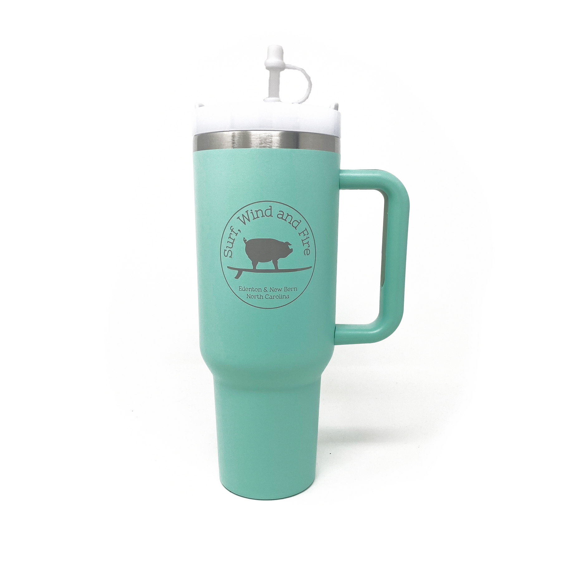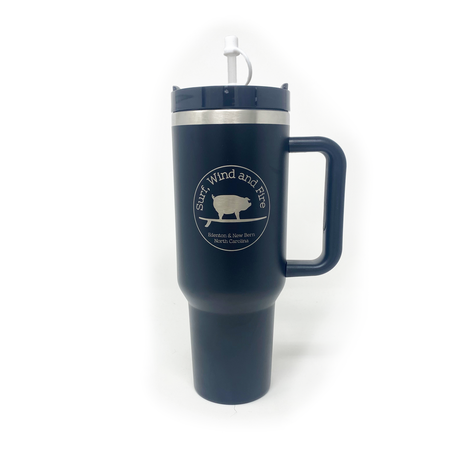 Stay hydrated on the go with The Big Sipper! This huge 40oz. water bottle is laser etched with the Surf, Wind and Fire Surfing Pig logo, has a handle, and will STILL fit in your car cup holder!